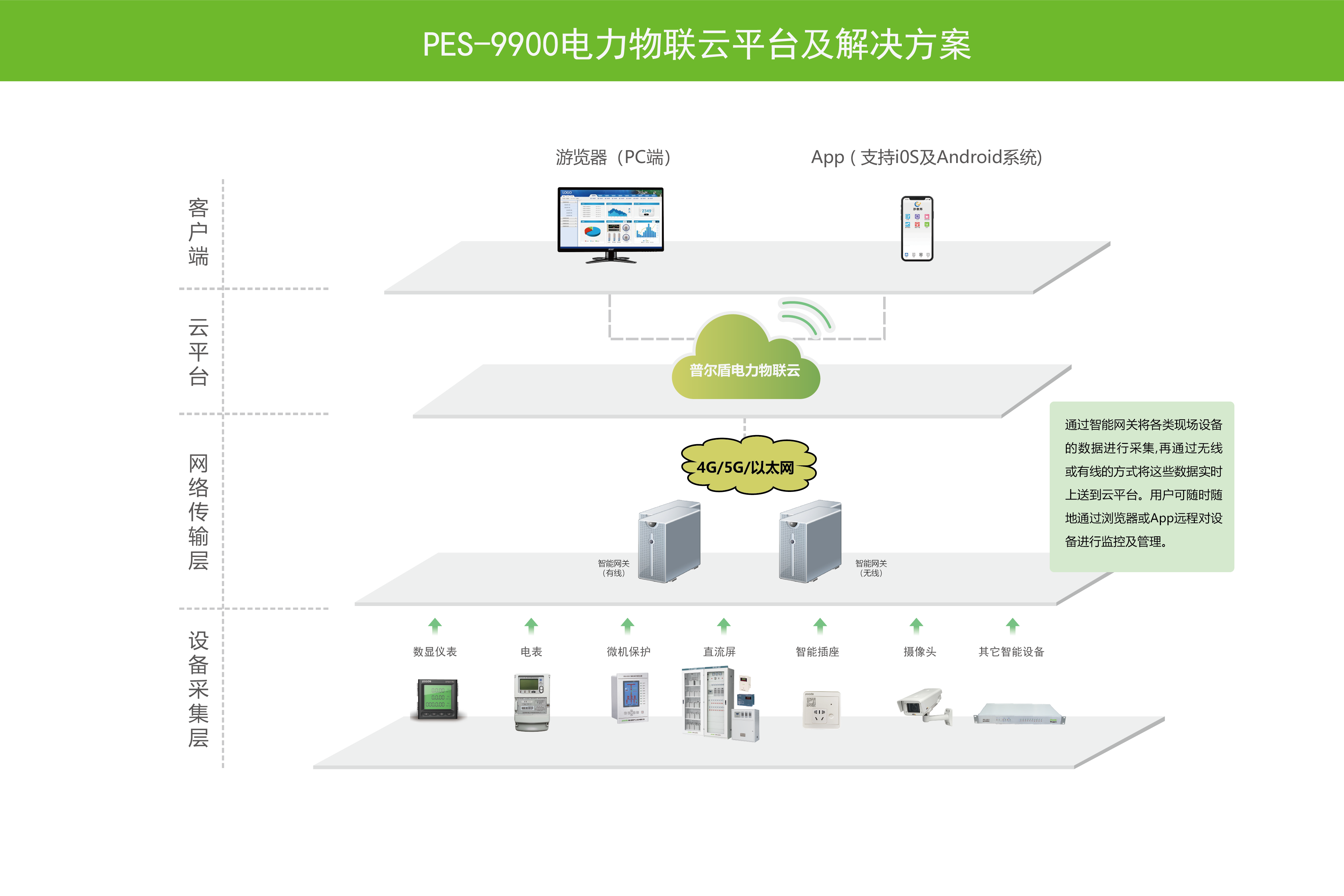PES-9900电力物联云平台是普尔盾电气(上海)有限公司依靠“阿里云”的服务器,将现场设备通过智能网关(有线或无线的方式)将这些数据进行采集并实时上送到云平台,用户可随时随地通过浏览器或App远程对设备进行监控及管理。